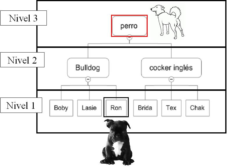 -En nuestro ejemplo, “Ron” refiere a un perro en concreto (el de mi vecino), mientras que “Bulldog” refiere a una clase, es decir, a un conjunto de perros que se caracteriza por compartir ciertos atributos. Así pues, diremos que “Bulldog” es un concepto de un mayor nivel abstracción que “Ron”.