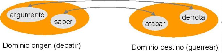 Pongamos como ejemplo la metáfora “aquel argumento fue su derrota”. Estamos relacionando ámbitos (dominios) diferentes, a saber: el del debatir y el del guerrear.