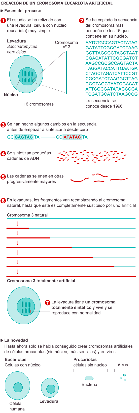La versión natural del cromosoma 3 de Saccharomyces cerevisiae tiene 316.667 bases (las letras del ADN a, g, t, c). La versión sintética es un poco más corta, con 273.871 bases, como consecuencia de las más de 500 alteraciones que los científicos han introducido en él. Entre estas modificaciones se encuentra la eliminación de muchos tramos de ADN repetitivo que no tienen función alguna, ya estén situados entre un gen y otro (secuencias intergénicas) o dentro mismo de los genes (intrones).