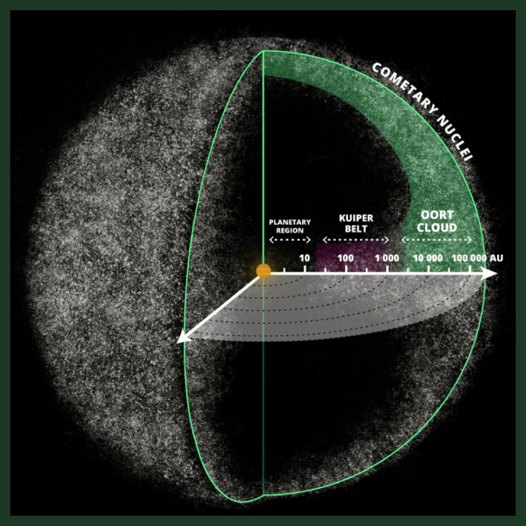 El Sistema Solar parecería estar envuelto en una hipotética capa formada por billones de cuerpos (compuestos por hielo, metano, etano, CO, HCN y roca) cuya masa se estimaría como equivalente a 5 planetas Tierra. Esta membrana exterior, llamada Nube de Oort, definiría la última frontera de nuestro sistema estelar y el inicio en rigor del espacio interestelar.